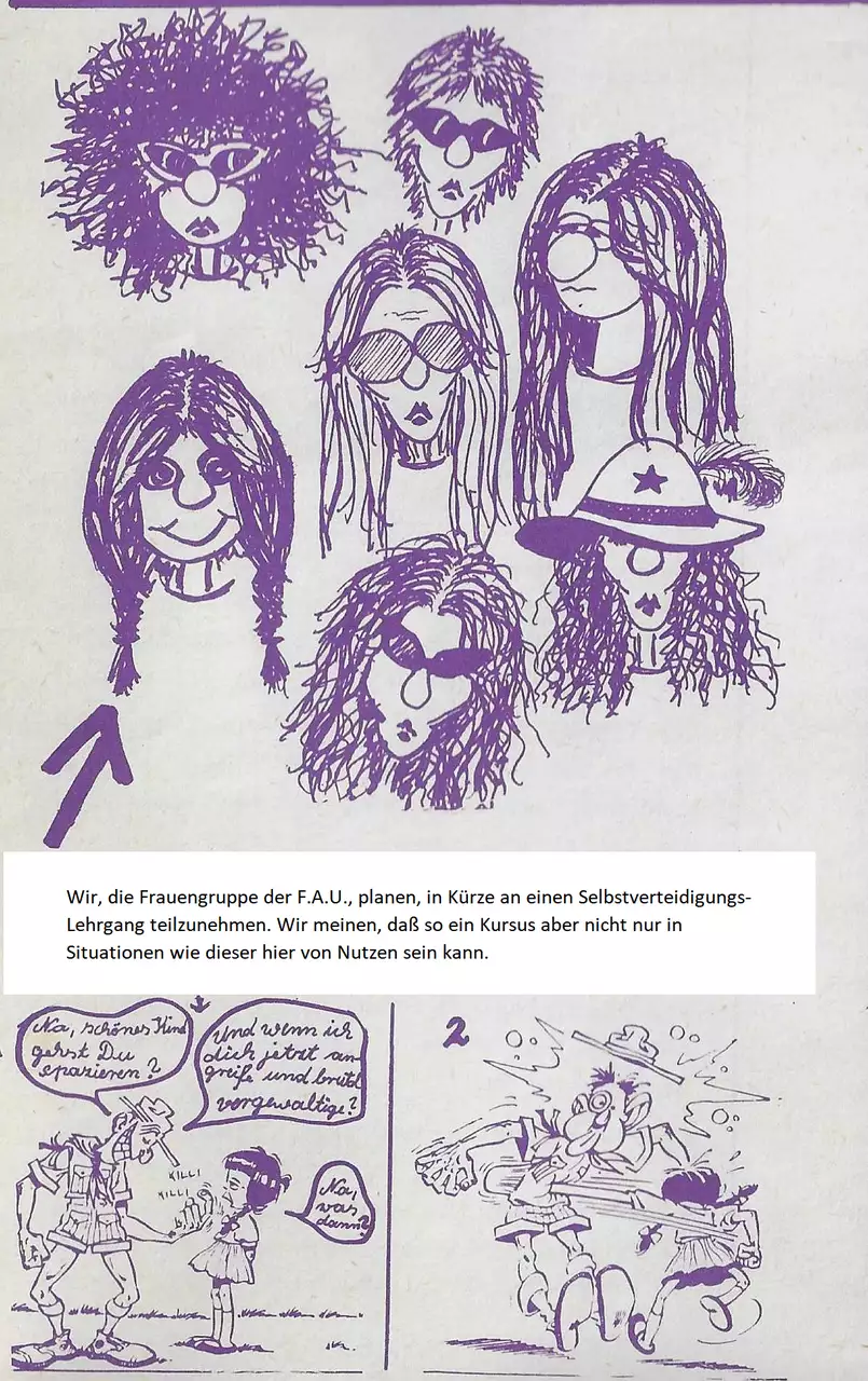 Dies und die besondere Ausbeutung und Unterdrückung von Frauen in allen gesellschaftlichen Bereichen (Ehe, Familie, Ausbildung und Betrieb, Werbung etc.) führte dazu, daß wir es auch in der F.A.U. nötig fanden, eine Frauengruppe zu gründen. Wir erarbeiteten uns die gesellschaftlichen Hintergründe, die zur Entstehung und zur Aufrechterhaltung des Patriarchats gehörten und versuchen, die Ergebnisse dieser Arbeit (die sicherlich nie ganz abgeschlossen sein kann) überall dort, wo wir etwas unterwandern oder angreifen, umzusetzen. Deshalb haben wir auch unseren ersten, mit Patriarchat überschriebenen Teil des programmatischen Entwurfes, noch einmal überarbeitet und erweitert; er wird in der nächsten Nummer der 'Befreiung' erscheinen. Diesmal hatten wir Bock, eine Frauenseite zu machen, obwohl, als das dann anfing wieder mal In Arbeit auszuarten, der uns schon funk vergangen wäre. Andererseits – ganz ohne Bock-Prinzip geht es nun auch nicht. Neulich, nach einem Streß-Termin, haben wir uns das mal laut überlegt; Ergebnis war die Idee, das eine sinnvoll mit dem anderen zu verbinden - wir werden es mal mit Straßentheater versuchen.