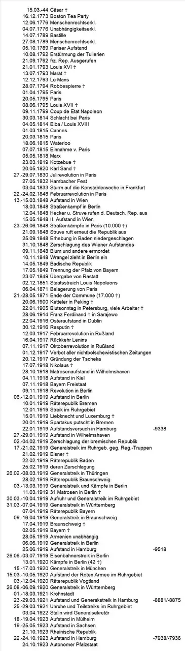 Um 400 Ma (Megajahre BCE) wagen sich kleine Amphibien aufs Land, Reptilien und Insekten entstehen. Um 300 Ma erscheinen die Vorfahren der Dinosaurier. Gegen 200 Ma beginnt das Zeitalter der Dinos, welches gegen 80 Ma endet. Während dieser Phase entwickeln sich erste Säugetiere, ihr Leben im Schatten der Dinos fristend und Vögel erscheinen. Zwischen 80 und 60 Ma entwickeln sich Prosimier auf Bäumen. Gegen 40 Ma entstehen Affen und Menschenaffen. Etwa um 10 Ma lebt Ramapithecus in Indien und Afrika. Gegen 4 Ma taucht dortselbst der Australopithecus auf. Um 2 Ma erster Werkzeuggebrauch in Afrika. Zwischen 2 und 1 Ma taucht Homo in Ostindien und Afrika auf. Um 1 Ma durchwandert er die Tropen der Alten Welt. Gegen 800 Ka (Kilojahre BCE) bevölkert er die gemäßigten Zonen. Zwischen 800 und 600 Ka erlernt er den Gebrauch des Feuers. Gegen 500 Ka finden in Europa große, organisierte Elefantenjagden statt. Ab 400 Ka baut man künstliche Heimstätten aus Zweigen und Fell. Zwischen 200 und 80 Ka lebt der Herr aus dem Neandertal in Europa. Ab 60 Ka finden in Europa und im Fruchtbaren Halbmond (HM) rituelle Begräbnisse statt. Neandertaler jagen Wollmammute in Europa. Zwischen 50 und 40 Ka gerät der Höhlenbär in den Mittelpunkt kultischer Verehrung in Europa. Zwischen 40 und 30 Ka erscheint der Cromagnon in Europa. Zwischen 30 und 20 Ka erreicht er Australien. Es entsteht die älteste bekannte schriftliche Aufzeichnung in Europa (Mondkalender auf Knochen). Überquerung der Beringstraße. Figurinen werden hergestellt, Höhlen bemalt. Um 20 Ka Erfindung der Nähnadel. Zwischen 20 und 10 Ka beginnen die Bisons auf den Great Plains um ihr Leben zu bangen. Gegen 10 Ka erfindet ein gescheiter Europäer Pfeil und Bogen. Und nun Schlag auf Schlag: 10-9 Ka Hund in Nordamerika. 9 Ka Jericho, Schaf im HM. 8 Ka Keramik in Japan. 8-7 Ka Ziege in Persien, Weizen und Gerste im HM. 7-6 Ka dörfliches Leben im HM, Handelszentrum Çatal Hüyük, Webstuhl im HM, Ackerbau verdrängt langsam die Jagd in Europa. 6-4 Ka Rindvieh im HM, im Mittelmeerraum wird Kupfer gehandelt. 4-3,5 Ka Mais in Mexiko, Segelboot in Ägypten, Megalithe in der Bretagne, Stadtkultur in Sumer, Rollsiegel im HM. 3,5-3 Ka Kartoffel in Südamerika, Rad in Sumer, ägyptische Handelsschiffe befahren das Mittelmeer, Bilderschrift im HM. 3-2,6 Ka Werkzeug aus Bronze im HM, Stadtleben im Nildelta, Pflug im HM, Kalender in Ägypten, Töpferscheibe in Sumer, Seidenraupe in China, Minoer im Atlantik, Gilgamesch-Epos. 2,6-2,5 Ka Pyramiden in Ägypten, Städte im Industal. 2,4-2 Ka Stonehenge, Gesetzessammlung in Sumer, Huhn und Elefant im Industal. 2-1,5 Ka Bronze bis nach Europa, Eskimo in Beringstraße, Reis in Fernost, Pferde (auch zum Reiten) in Zentralasien, Auslegerkanu für die Südsee. 1,5-1,4 Ka Pflasterstraße auf Kreta, Bronzeskulptur in China, Imperium der Hethiter. 1,4-1 Ka Eisenverarbeitung in Kleinasien, Alphabet in Ugarit, Hebräer erfinden den Monotheismus. 10-9 Ha (Hektojahre BCE) Ren in Nordeuropa, modernes Alphabet der Phönizier. 8-7 Ha Kelten verarbeiten Eisen in ganz Europa, russische Nomaden begründen Pferdezuchtkultur, Landstraßensystem in Assyrien, Ilias und Odyssee, Gründung Roms. 7-2 Ha Schubkarre in China, Mahabharata und Ramayana. 2-0 Ha Schöpfrad im HM.